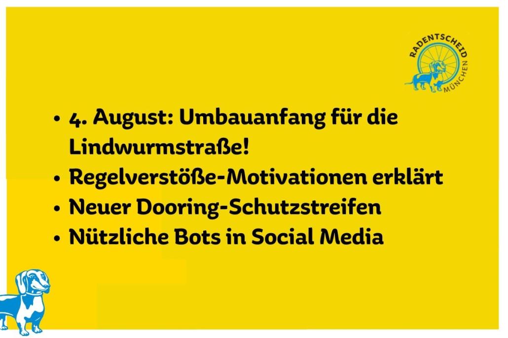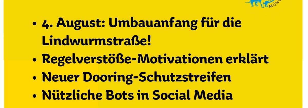 4. August: Umbauanfang für die Lindwurmstraße! Auch: Motivationen erklärt, neuer Dooring-Schutzstreifen, nützliche Bots in Social Media, und Terminhinweise
