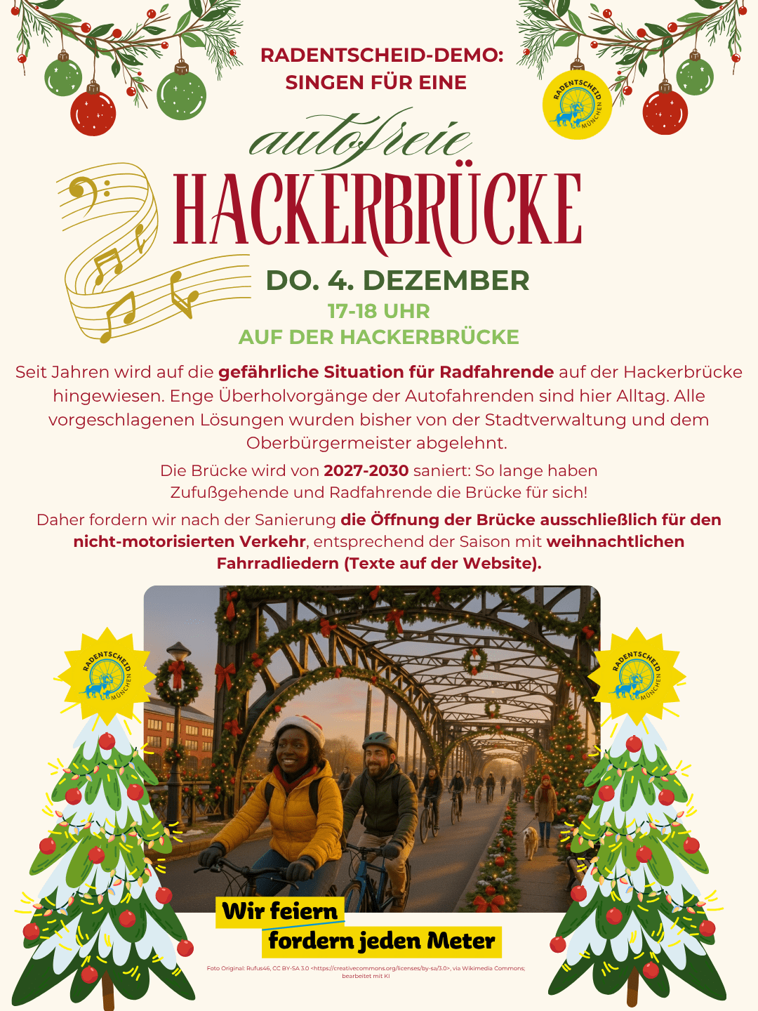 Unser Plan: Wir stellen uns mit einem Weihnachtsbaum auf die Fahrbahn und singen weihnachtliche Fahrrad-Lieder bzw. „fahrradliche“ Weihnachtslieder.