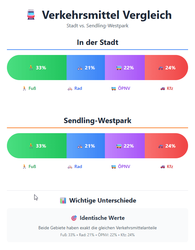 In Oktober 2025 hat die Stadt die Ergebnisse der Haushaltsbefragung „Mobilität in Städten“ aus 2023 veröffentlicht - jeder Bezirk hat eine eigene Grafik bekommen mit den Verkehrsmittelanteilen, auch Modal Split benannt.  Fußverkehr und Radverkehr nehmen grundsätzlich überall in München zu!
