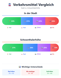 In Oktober 2025 hat die Stadt die Ergebnisse der Haushaltsbefragung „Mobilität in Städten“ aus 2023 veröffentlicht - jeder Bezirk hat eine eigene Grafik bekommen mit den Verkehrsmittelanteilen, auch Modal Split benannt.  Fußverkehr und Radverkehr nehmen grundsätzlich überall in München zu!