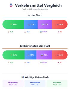 In Oktober 2025 hat die Stadt die Ergebnisse der Haushaltsbefragung „Mobilität in Städten“ aus 2023 veröffentlicht - jeder Bezirk hat eine eigene Grafik bekommen mit den Verkehrsmittelanteilen, auch Modal Split benannt.  Fußverkehr und Radverkehr nehmen grundsätzlich überall in München zu!