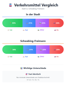In Oktober 2025 hat die Stadt die Ergebnisse der Haushaltsbefragung „Mobilität in Städten“ aus 2023 veröffentlicht - jeder Bezirk hat eine eigene Grafik bekommen mit den Verkehrsmittelanteilen, auch Modal Split benannt.  Fußverkehr und Radverkehr nehmen grundsätzlich überall in München zu!