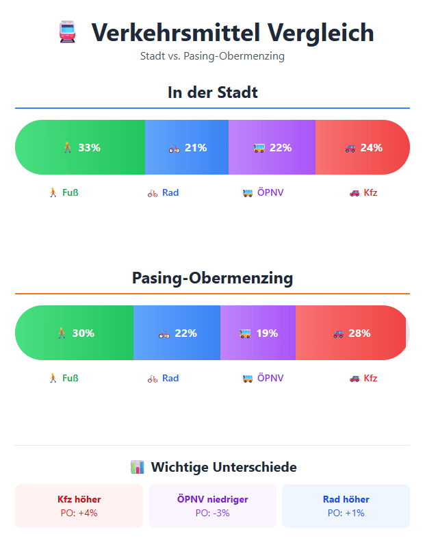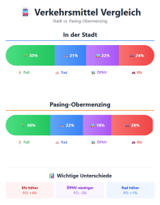In Oktober 2025 hat die Stadt die Ergebnisse der Haushaltsbefragung „Mobilität in Städten“ aus 2023 veröffentlicht - jeder Bezirk hat eine eigene Grafik bekommen mit den Verkehrsmittelanteilen, auch Modal Split benannt.  Fußverkehr und Radverkehr nehmen grundsätzlich überall in München zu!